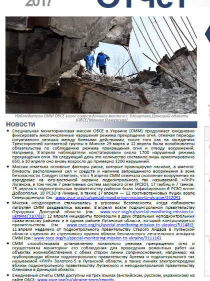 В отчете представлен обзор работы Специальной Мониторинговой Миссии ОБСЕ (СММ), последние события и новости по состоянию на 19 апреля 2017 года.