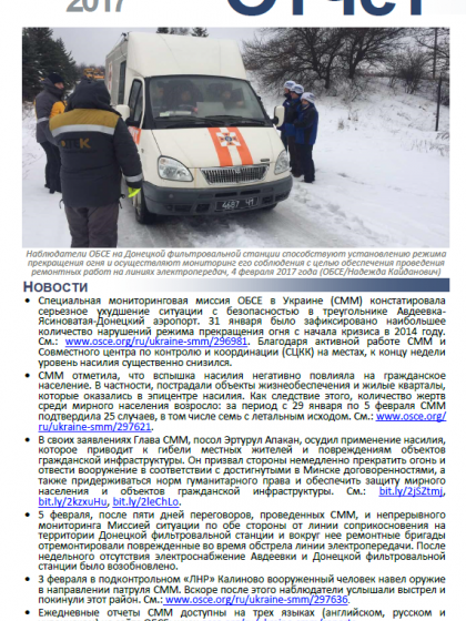 В отчете представлен обзор работы Специальной Мониторинговой Миссии ОБСЕ (СММ), последние события и новости по состоянию на 8 февраля 2017 года.