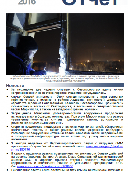 В отчете представлен обзор работы Специальной Мониторинговой Миссии ОБСЕ (СММ), последние события и новости по состоянию на 23 ноября 2016 г.