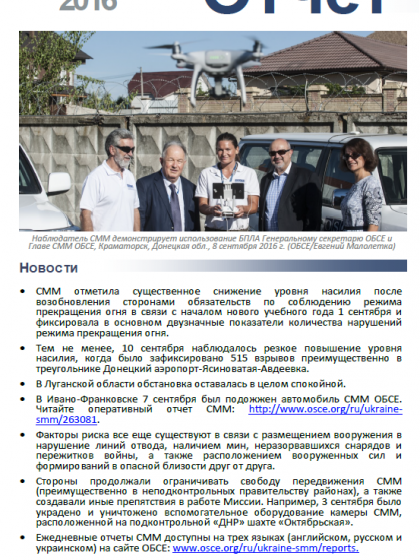 В отчете представлен обзор Специальной Мониторинговой Миссии ОБСЕ (СММ), последние события и новости по состоянию на 14 сентября 2016 г.