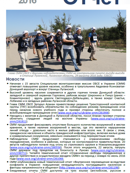 В отчете представлен обзор Специальной Мониторинговой Миссии ОБСЕ (СММ), последние события и новости по состоянию на 31 августа 2016 г.