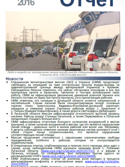 В отчете представлен обзор Специальной Мониторинговой Миссии ОБСЕ (СММ), последние события и новости по состоянию на 17 августа 2016 г.