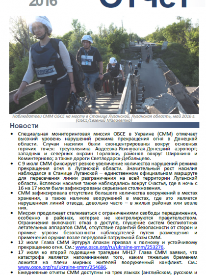 В отчете представлен обзор Специальной Мониторинговой Миссии ОБСЕ (СММ), последние события и новости по состоянию на 20 июля 2016 г.