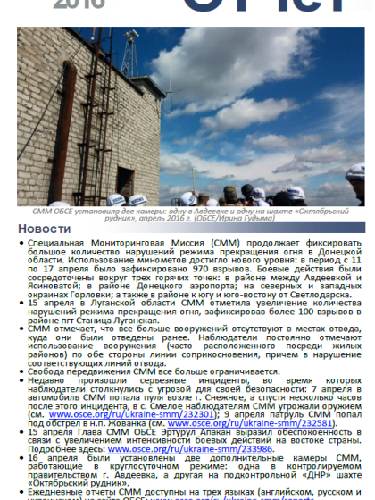 В отчете представлен обзор Специальной Мониторинговой Миссии ОБСЕ (СММ), последние события и новости по состоянию на 20 апреля 2016 г.