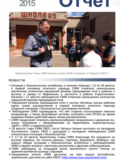 В отчете представлен обзор Специальной Мониторинговой Миссии (СММ) ОБСЕ, последние события и новости по состоянию на 26 августа 2015.