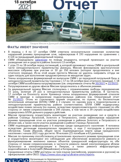 В отчете представлен обзор работы Специальной мониторинговой миссии ОБСЕ (СММ), последние события и новости по состоянию на 18 октября 2021 года.