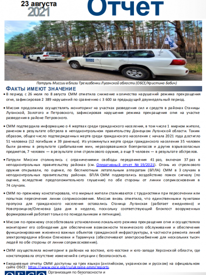 Отчет о работе по состоянию на 9 августа 2021 года_В отчете представлен обзор работы Специальной мониторинговой миссии ОБСЕ (СММ), последние события и новости по состоянию на 9 августа 2021 года.