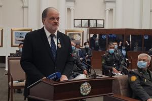Посол Джон МакГрегор обращается с приветственным словом к участникам международной научной конференции 4-5 ноября 2020 года в академии Вооруженных Сил Узбекистана.