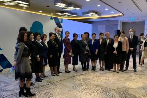 Посол Джон МакГрегор, Председатель Сената Танзила Нарбаева, постоянный представитель ПРООН в Узбекистане Матильда Димовска, и женщины-парламентарии во время первого Форума женщин-парламентариев Узбекистана,Ташкент, 14 декабря 2020 года, г.