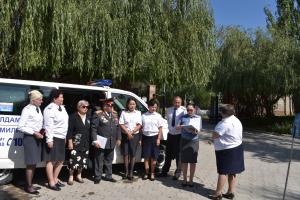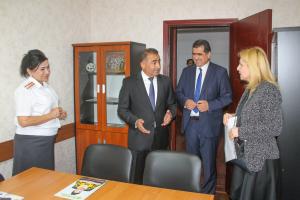 Заместитель главы Программного офиса ОБСЕ в Душанбе Тея Джалиашвили (с правой стороны) и представители Министра внутренних дел Таджикистана (МВД) на церемонии сдачи рабочего кабинета Женского совета МВД, город Душанбе, 14 июня 2022.