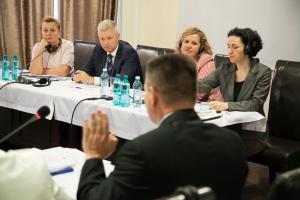 Светлана Новак, председатель колледжа аттестации судей, Виктор Мику, Председатель Высшего совета магистратуры Молдовы, Рита Тамм, советник по правам человека в Миссии ОБСЕ в Молдове, и Тина Джевис, руководитель отдела БДИПЧ по верховенству закона, (слева направо) слушают выступление Геннадия Eни из колледжа аттестации судей на встрече по оценки качества работы судей в Молдове, Кишинев, 27 июня 2014 года.