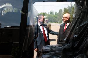 Рустам Мамасадыков, Заместитель Председателя – Директор Анти-террористического Центра Государственного комитета национальной безопасности Кыргызской Республики (ГКНБ КР)(л) и Посол Сергей Капинос, Главы Центра ОБСЕ в Бишкеке на церемонии передачи автомобиля «Газель» Службе специального назначения ГКНБ Кыргызской Республики, Бишкек, 19 Мая, 2014 г.