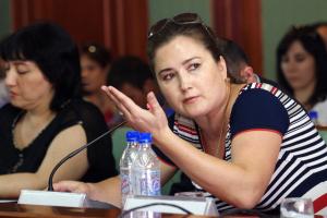 Лариса Александрова, сотрудница Центра НПО по правам человека, выступает с докладом на тему доступа женщин к правосудию во время Подготовительного совещания по рассмотрению выполнения обязательств, посвященное человеческому измерению. Совещания было проведено Бюро ОБСЕ в Таджикистане, Душанбе, 2 июля 2012 года.