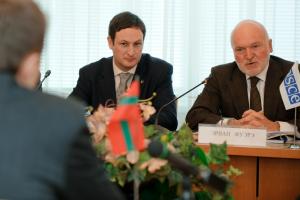 Посол Эрван Фуэре, Специальный представитель Действующего председателя ОБСЕ по приднестровскому урегулированию и Джеймс O'Ши, представитель Постоянной миссии Ирландии при ОБСЕ на встрече с политическим руководством в Тирасполе, 2 февраля 2012 года. (ОБСЕ)