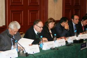 Слева направо: Омбудсмен Турсунбек Акун, исполняющий обязанности главы Центра ОБСЕ в Бишкеке Андерс Трёдссон и глава Представительства ЕС в Кыргызской Республике Посол Шанталь Эбберехт на открытии дискуссии в формате круглого стола, организованного Центром ОБСЕ в Бишкеке, 22 февраля 2012 года.
