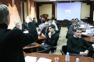 Профессор Пауль Меерц из нидерландского Института международных отношений “Clingendael” помогает экспертам из совместных рабочих групп сторон приднестровского конфликта усовершенствовать навыки ведения переговоров на занятиях в рамках тренинга ОБСЕ. Вадул-луй-Водэ, 14 февраля 2012 г.