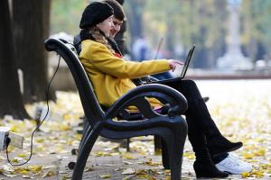 Молодые люди могут пользоваться бесплатным беспроводным интернетом в Центральном парке Кишинева, 3 ноября 2011.