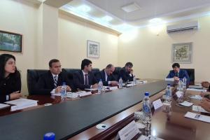 Участники обзорной встречи по выполнению Национального плана действий Таджикистана в рамках резолюции 1540 Совета Безопасности ООН о нераспространении оружия массового уничтожения, Гулистон, Согдийская область, 12 ноября 2021 года.