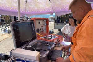 Координатор учебных погружений даёт инструкции водолазу, находящемуся под водой,Актау, 21 июля 2021 г.