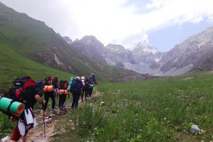 Участники похода приспосабливаются к высоте 2800 метров, горы Газнок, Айнинский район, Таджикистан, 26 июня 2021 года.