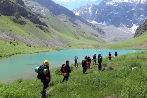Участники любуются горным ландшафтом. Привал у высокогорного озера в горном массиве Газнок, Таджикистан, 26 июня 2021 года.