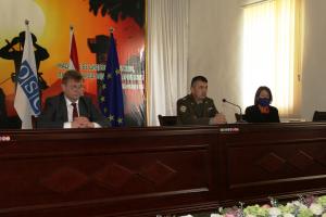 (слева направо) Валериу Киверь, Глава Программного офиса ОБСЕ в Душанбе; полковник Раджабзода Насим Холмурод, Первый заместитель Председателя-Командующего Пограничными войсками Государственного комитета национальной безопасности Республики Таджикистан и Петра Гашпарова, заместитель Главы Делегации ЕС в Таджикистане, район Хамадони, Хатлонская область, 5 марта 2021 года.