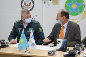 Глава Пограничной академии Комитета национальной безопасности полковник Павел Поливанов и глава Офиса программ ОБСЕ в Нур-Султане Дьердь Сабо во время церемонии подписания договора о дарении, Алматы, 25 декабря 2020 г.
