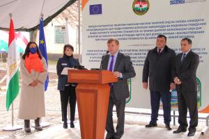 Валериу Киверь, Глава Программного офиса ОБСЕ в Душанбе, выступает на церемонии официального начала ремонтных работ в Учебном центре Комитета по чрезвычайным ситуациям и гражданской обороне Таджикистана, Каратаг, Шахринавский район, 19 января 2021 г.