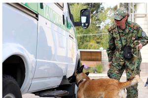 Офицер кинолог и ее служебная собака обнаруживают незаконные предметы, спрятанные в фургоне, во время трехнедельного семинара по обучению инструкторов при поддержке ОБСЕ в Региональном учебном центре Всемирной таможенной организации в Бишкеке, Бишкек, 25 октября 2019 г.