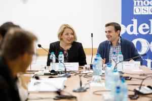 Международный эксперт Ида Мантон беседует с участниками Модели ОБСЕ для молодежи о переговорах, посредничестве и содействии диалогу в ОБСЕ, Вадул-луй-Вода, Молдова, 26 сентября 2019 года.