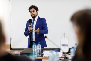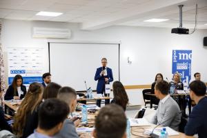 Специальный представитель действующего председателя ОБСЕ по делам молодежи и безопасности Самюэль Года, приветствует участников Модели ОБСЕ для молодежи, Вадул-луй-Вода, Молдова, 26 сентября 2019 года.