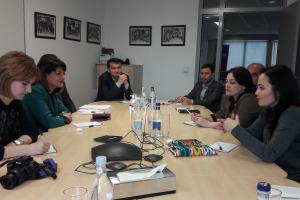 Манижа Мухаммад (справа), директор компании Sifat Innotech Invest и Гаяне Маркосян (слева в середине), Менеджер по связям с общественностью и информации компании Synopsys Armenia, обсуждают шаги, предпринятые в направлении цифровизации экономики в Таджикистане, Ереван, 17 апреля 2019 года.