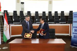 Роберт Хойер (слева), глава Департамента по человеческому измерению Офиса программ ОБСЕ в Душанбе и Солех Завкизода (справа), Директор Учебного центра судей на церемонии передачи офисного оборудования, Душанбе, 19 апреля 2019 года.