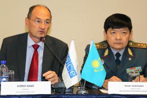 Посол Дьердь Сабо (слева), Глава Офиса программ ОБСЕ в Астане, выступает на открытии регионального семинара по вопросам сокращения рисков взрывоопасных предметов и реагированию на них, Астана, 11 сентября 2018 г.