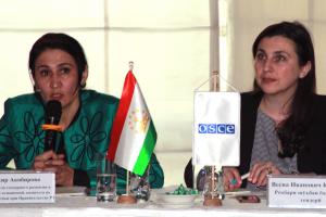 Джавохир Акобирова, Начальник управления по вопросам гендерного развития и международным делам Комитета по делам женщин и семьи при Правительстве РТ (слева) и Весна Иванович-Кастаред, сотрудник по гендерным вопросам и вопросам борьбы с торговлей людьми Офиса программ ОБСЕ в Душанбе (справа) в ходе круглого стола по вопросам национальных и международных обязательств в области гендерного равенства, Душанбе, 13 декабря 2017 г.