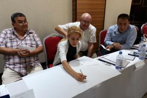 Участники во время групповых заданий анализируют текст для улучшения знаний по использованию передового опыта в подготовке и редактировании текстов, Шымкент, 25 сентября 2017 г.