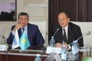 (справа налево) Посол Дьердь Сабо, Глава Офиса программ ОБСЕ в Астане и Вице-министр энергетики РК Гани Садибеков на семинаре по вопросам стандартов зеленого строительства, прошедшего при поддержке ОБСЕ, Астана, 21 сентября 2017 г.