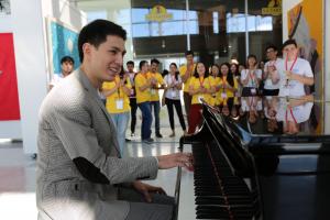Участник Центрально-азиатской молодёжной сети (CAYN) исполняет хиты мировой музыки на фортепиано во время перерыва, Астана, 28 июня 2017 г.