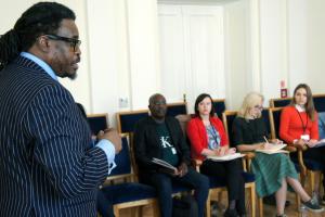 Советник БДИПЧ по борьбе с расизмом и ксенофобией Ларри Оломофе выступает на семинаре для активистов молодежных общественных организаций, Варшава, 26 сентября 2016 г.