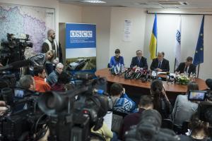 Глава СММ ОБСЕ в Украине посол Эртурул Апакан (по центру), Глава представительства ЕС в Украине посол Ян Томбинский (слева) и заместитель Главы Консультативной миссии Европейского Союза по реформированию сектора гражданской безопасности Украины Юг Фанту (справа) во время официальной церемонии передачи, Киев, 3 февраля 2016 года.