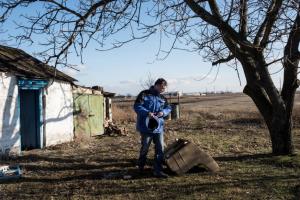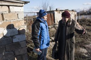 Руководитель Донецкой команды СММ ОБСЕ Ольга Скриповская разговаривает с жительницей Коминтерново, 15 января 2016 года.