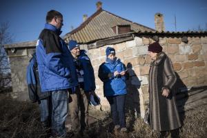 Наблюдатели СММ ОБСЕ общаются с местной жительницей, чей дом был поврежден во время обстрела, 15 января 2016 года.