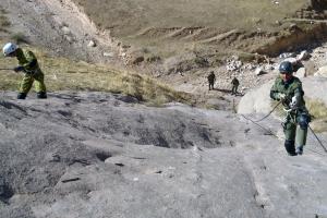 Таджикские пограничники на практических занятиях по альпинизму в рамках курса по патрулированию и руководству пограничным дозором-3, Гиссарский район, село Латтабанд, 29 октября 2015 г.