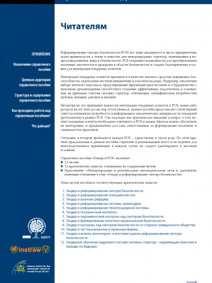 Реформирование сектора безопасности (РСБ) все чаще оказывается в числе приоритетных задач правительств, а также в повестке дня международных структур, занимающихся вопросами развития, мира и безопасности. РСБ открывает возможности для преобразования политики, институтов и программ в области безопасности и создает благоприятные условия для интеграции гендерных аспектов.