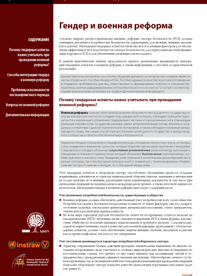 В данной практической записке предлагается краткое разъяснение преимуществ интеграции гендерных аспектов в военную реформу, а также информация о способах ее практической реализации.