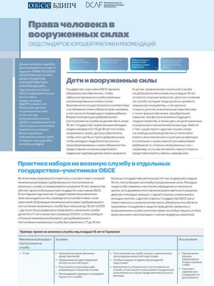 Государства-участники ОБСЕ приняли обязательство обеспечить, чтобы набор или призыв на службу в военных и военизированных силах и силах безопасности осуществлялся в соответствии с их обязанностями в области прав человека, в том числе по Конвенции о правах ребенка. Возрастной ценз для добровольного поступления на службу не должен быть ниже 16 лет. Государства, позволяющие молодым людям в возрасте от 16 до 18 лет поступать на военную службу, должны обеспечить, чтобы этот шаг был строго добровольным, чтобы молодые люди были полностью проинформированы о своих обязанностях, предоставили согласие родителей и надежное подтверждение своего возраста.