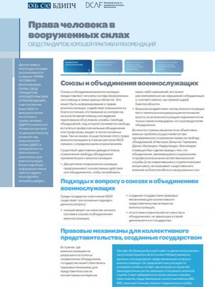 Союзы и объединения военнослужащих предоставляют личному составу вооруженных сил помощь в самых разных областях. Это может быть информирование о правах военнослужащих, содействие повышению их благосостояния, отстаивание их интересов, консультативная помощь или ведение переговоров об условиях службы. Свобода объединений, под которой понимается свобода вступать в профессиональные объединения или профсоюзы, входит в число основных прав. Тем не менее, осуществление этого права военнослужащими в странах региона ОБСЕ связано с определенными ограничениями.