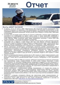 В отчете представлен обзор работы Специальной мониторинговой миссии ОБСЕ (СММ), последние события и новости по состоянию на 24 августа 2020 года.