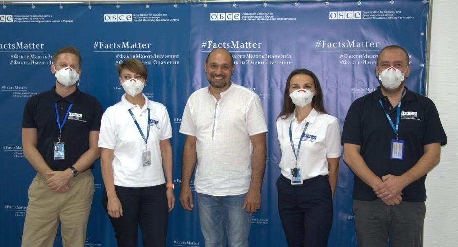 Вскоре прибывает Николай Бурлуцкий, которого приветствует команда СММ. Все одеты в маски в соответствии с мерами, введенными Миссией в связи с COVID‑19.