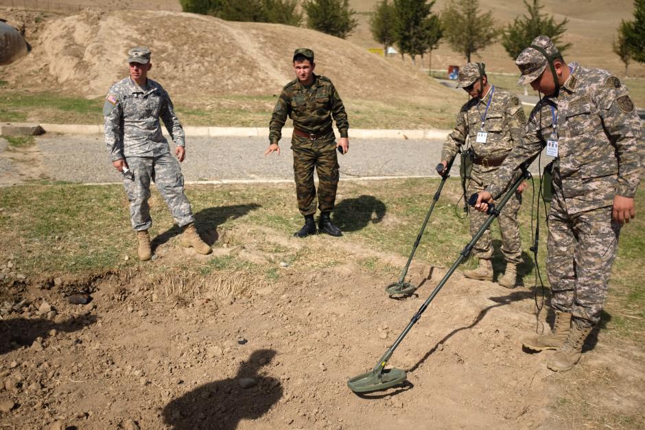 Таджикские и казахские специалисты по обезвреживанию взрывоопасных веществ во время занятий по обнаружению самодельных взрывных устройств с помощью металлоискателей, Лохур, район Рудаки, 29 сентября 2015 г.
